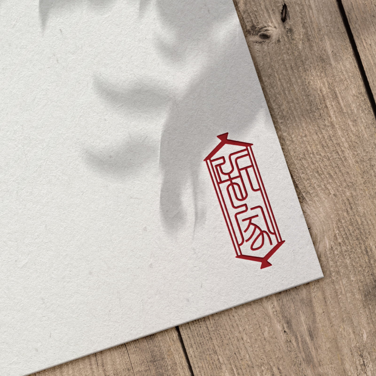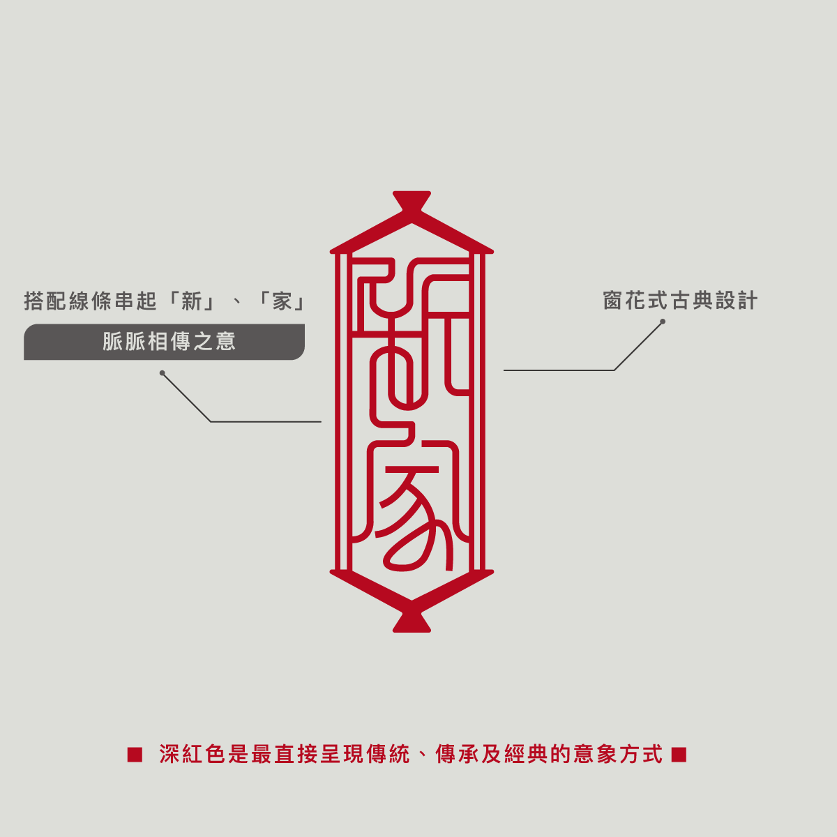 結合古代窗花,及台灣三合院老屋的屋簷意象,帶給人古典及傳統感。搭上朱紅色,是最直接呈現傳統、傳承及經典的顏色。搭配線條將字型整體拉長比例,串連起「新」、「家」兩字,亦有脈脈相傳之意。